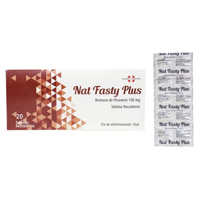 El Nat Fasty Plus 100mg contiene Bromuro de Pinaverio, un antiespasmódico de acción selectiva sobre el músculo liso del tracto gastrointestinal, indicado para el tratamiento del síndrome de colon irritable, espasmos intestinales y trastornos funcionales digestivos.